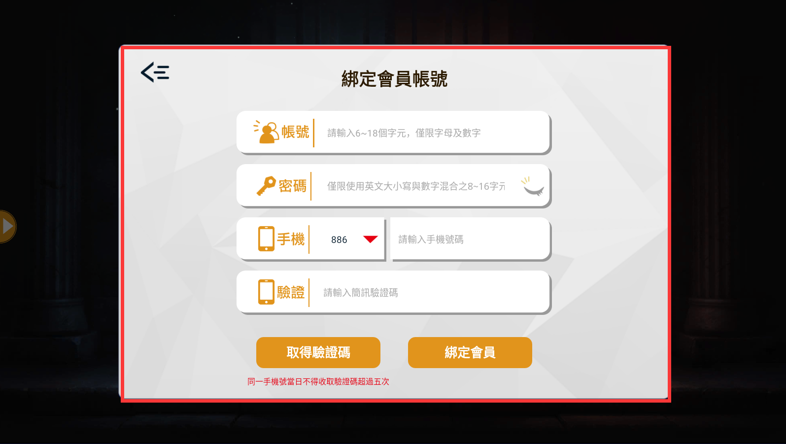 請您在此輸入將綁定的手機號碼以便收取簡訊驗證碼,輸入完後請點擊下方的【取得驗證碼】,您將收到簡訊驗證碼。日後若您忘記密碼,亦可透過此綁定的手機號碼收取簡訊領取新的密碼,這將會是很重要的一項資訊。