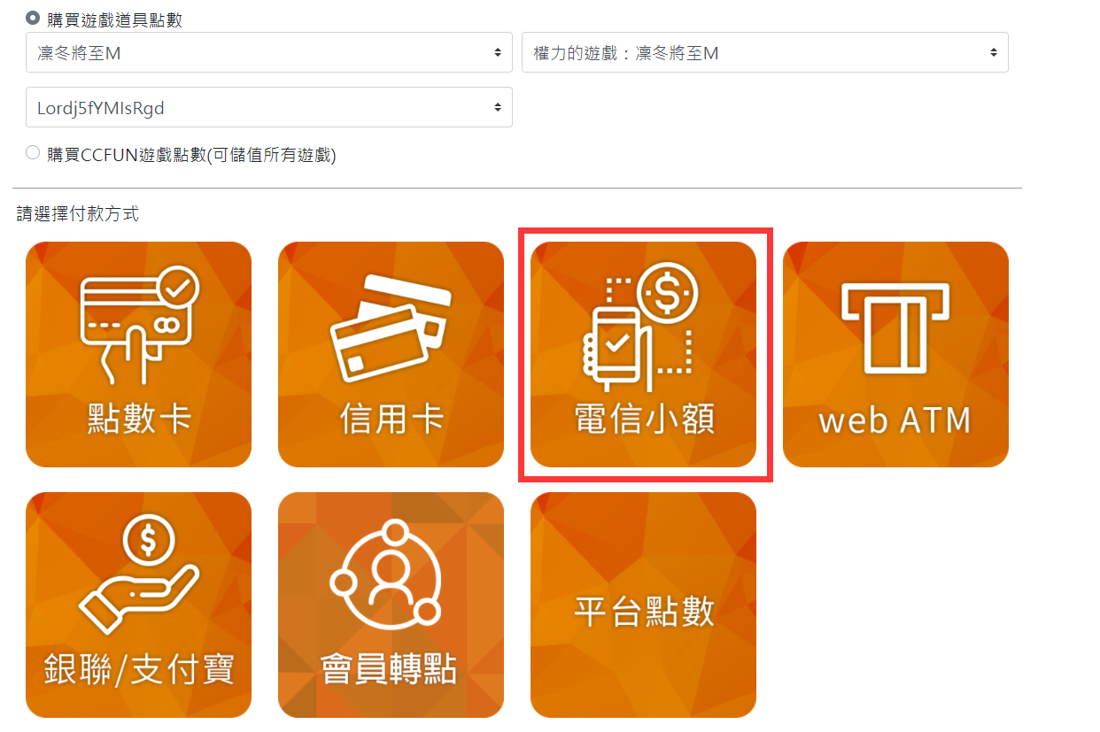 Step 2:選擇Gash電信小額或MyCard電信小額。(此處以Gash電信小額-遠傳手機儲值為例)