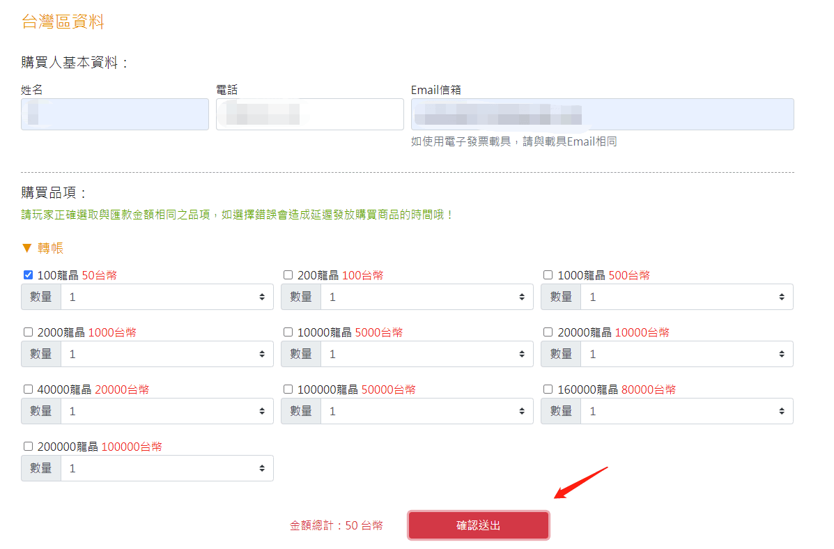 Step 4:都填寫完要購買的東西,按下最下方【確認送出】按鈕,即可收到匯款訊息